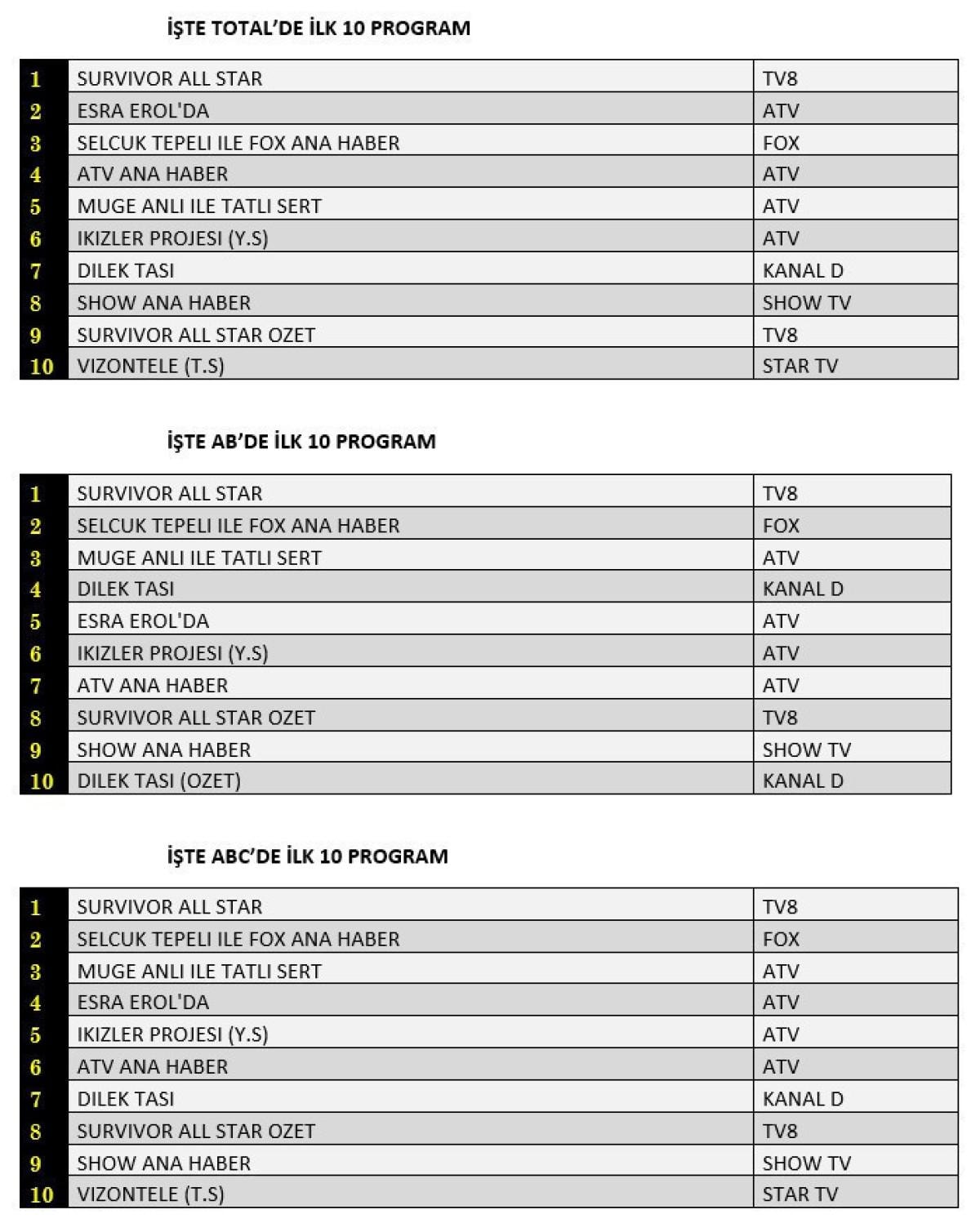 Her gün bir önceki güne ait Total, AB ve ABC sıralaması belli olurken dünün reyting sonuçları merakla bekleniyor.