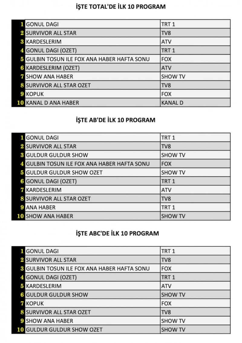 Total’de 1. sırada TRT 1’de izleyici ile buluşan “Gönül Dağı”, 2. sırada TV8’de ekranlara gelen “Survivor All Star”, 3. sırada ise ATV’de yayınlanan “Kardeşlerim” yer aldı.