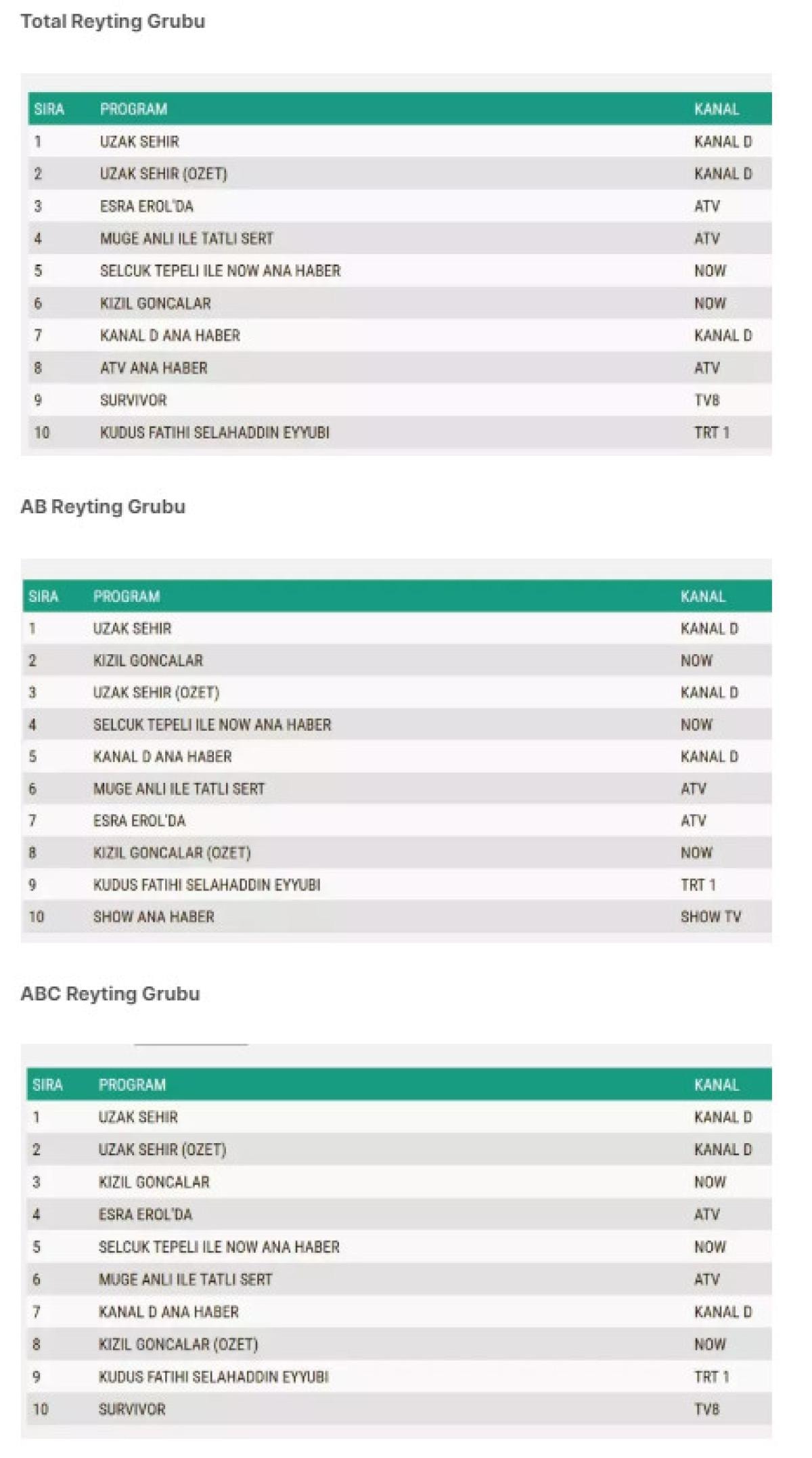 Her gün bir önceki güne ait Total, AB ve ABC sıralaması belli olurken dünün reyting sonuçları merakla bekleniyor.