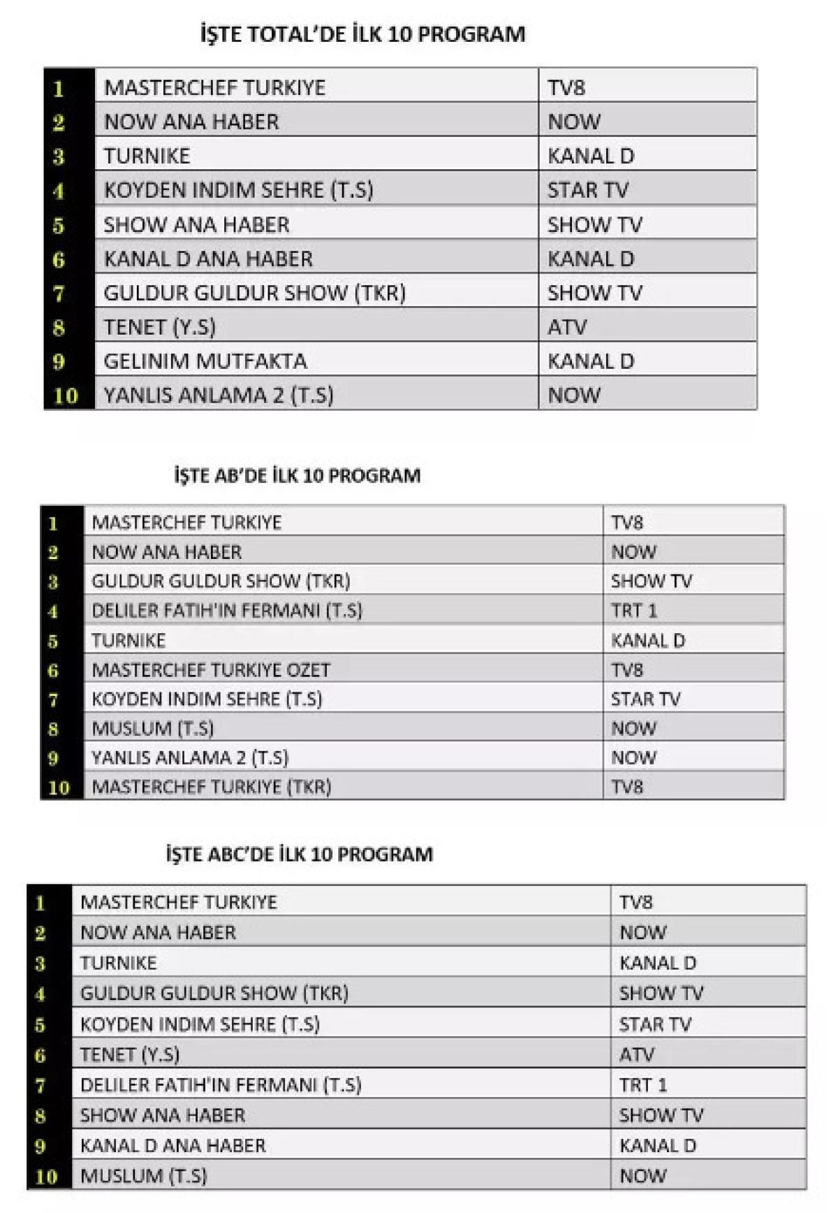 20+ABC1 grubunda ise birinci sırada Masterchef Türkiye, ikinci sırada NOW Ana Haber, üçüncü sırada Turnike yer aldı.