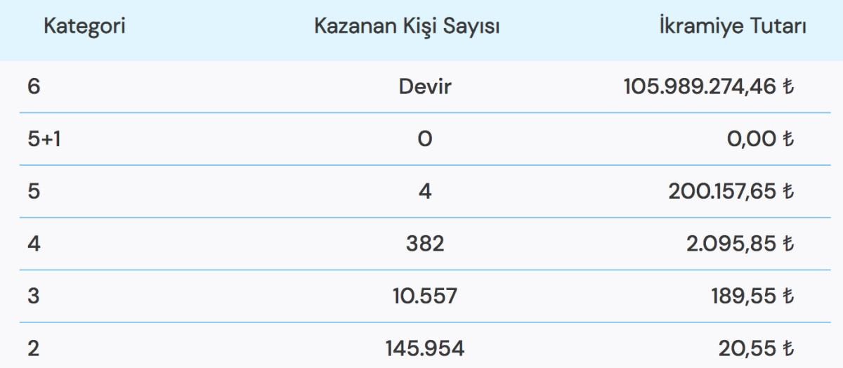 Büyük ikramiyenin 105.989.274,46 TL olduğu çekilişte 6 bilen çıkmadığı için büyük ikramiye devretti.