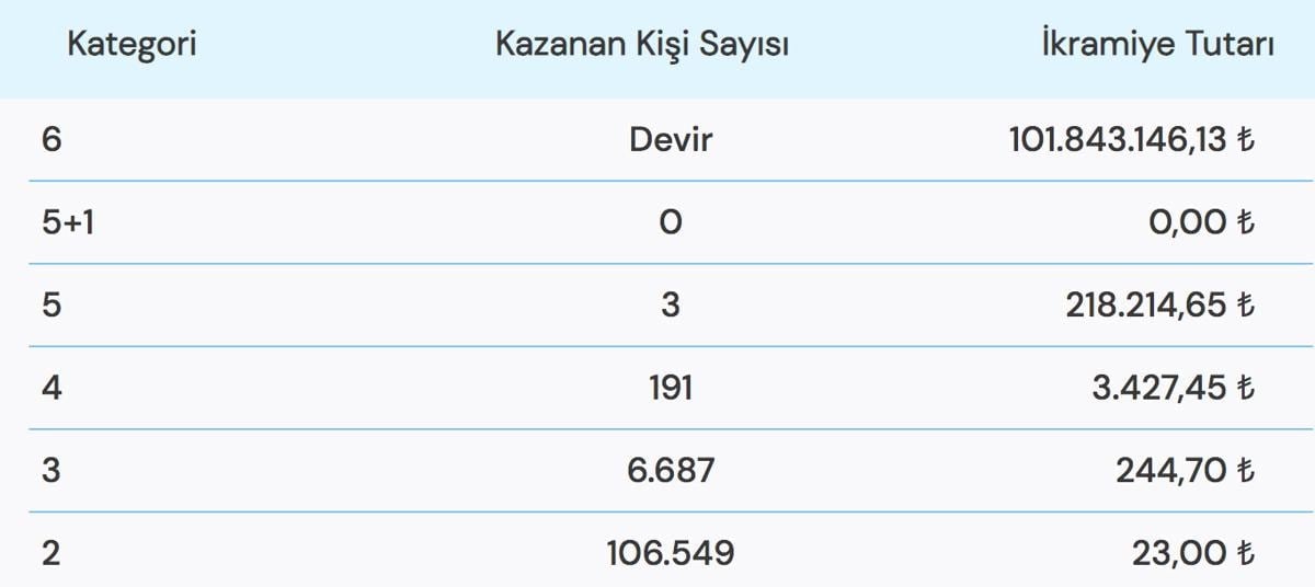 Büyük ikramiyenin 101.843.146,13 TL olduğu çekiliş sonuçlarına göre 6 bilen çıkmadığı için büyük ikramiye devretti.