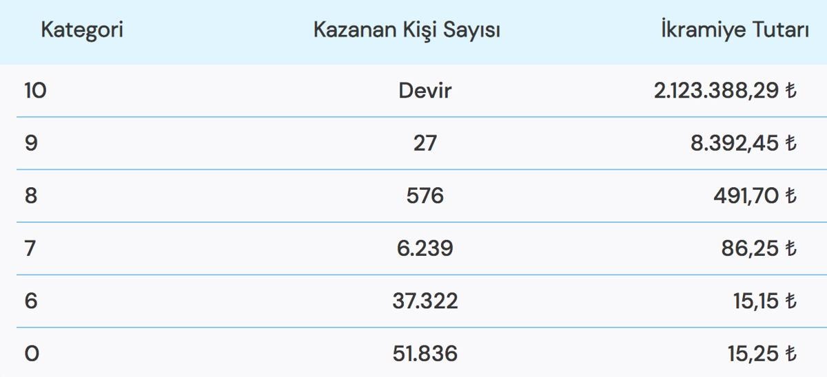 Çekiliş sonuçlarını öğrenmek isteyen şans oyunu tutkunları aramalarına hız kazandırdı. Büyük ikramiyenin 2.123.388,29 TL olduğu çekilişte 10 bilen çıkmadığı için ikramiye devretti.