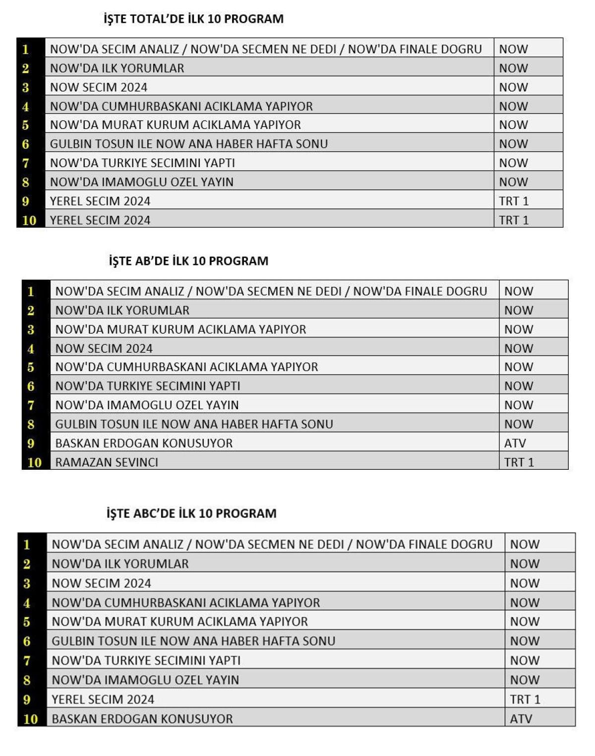 ABC1'de 1.sırada "NOW'da Seçim Analiz ", 2. sırada "NOW'da ilk yorumlar", 3.sırada "NOW Seçim 2024" yer aldı.