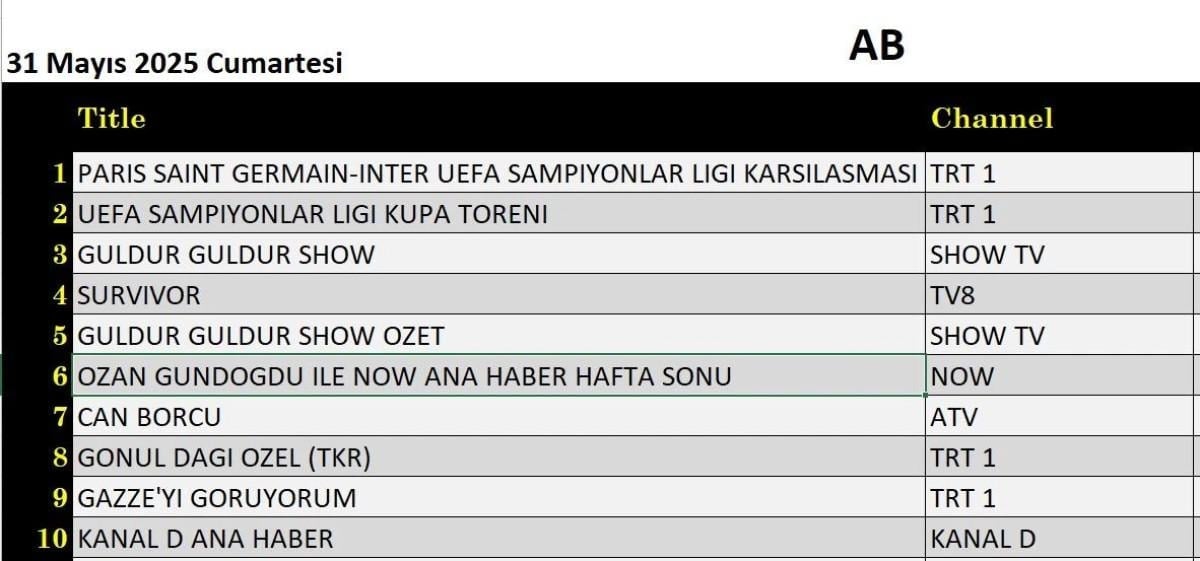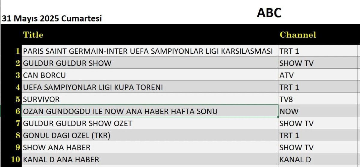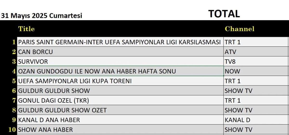 UEFA Şampiyonlar Ligi PSG - Inter final maçı, tüm kategorilerde zirveye yerleşti. ATV'nin sevilen dizisi Can Borcu ise Total'de ikinci sırayı kaptı. Üçüncü sıraya Survivor yarışma programı yerleşti.