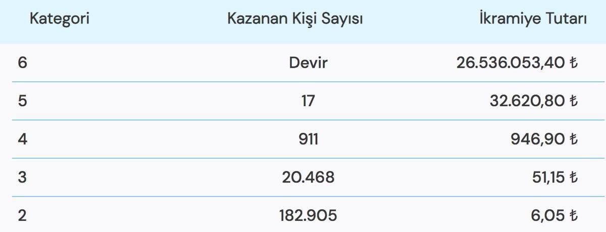 Büyük ikramiyenin 26.536.053,40 TL olduğu gecede 6 bilen çıkmadığı için büyük ikramiye bir sonraki çekilişe devretti