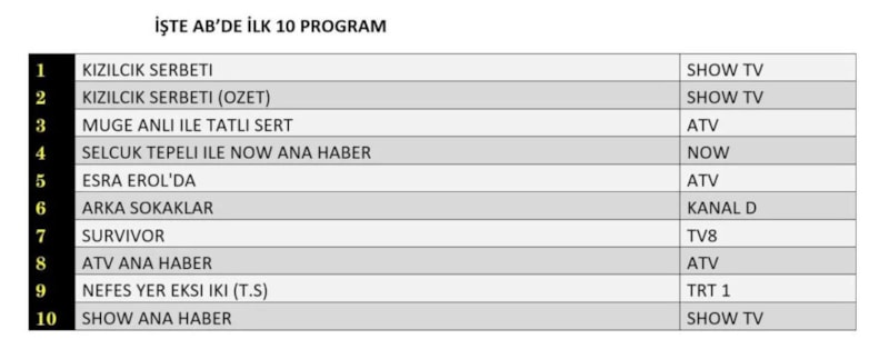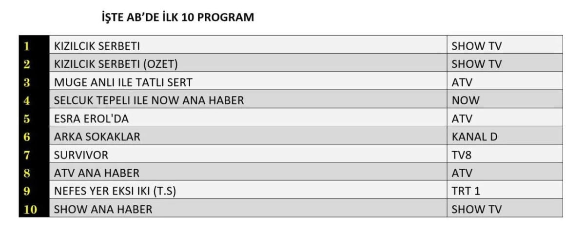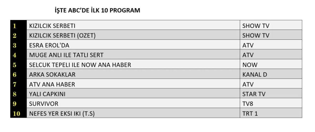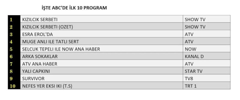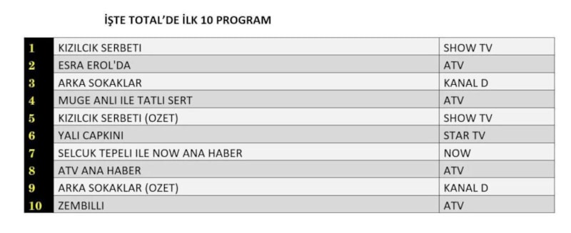 Her gün bir önceki güne ait Total, AB ve ABC sıralaması belli olurken dünün reyting sonuçları merakla bekleniyor.