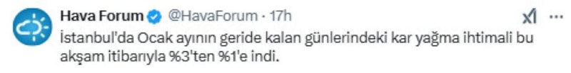 Yaptığı paylaşımda, “İstanbul'da Ocak ayının geride kalan günlerindeki kar yağma ihtimali bu akşam itibarıyla %3'ten %1'e indi.” ifadelerini kullandı.
