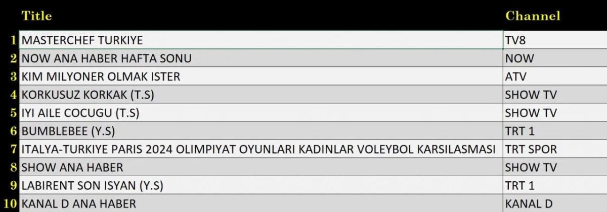 ABC'de ise 1.sırada “Masterchef Türkiye”, 2.sırada “İtalya-Türkiye Paris 2024 Olimpiyat Oyunları Kadınlar Voleybol Karşılaşması”, 3.sırada “Kim Milyoner Olmak İster” yer aldı.