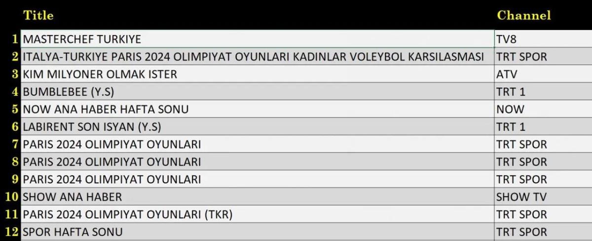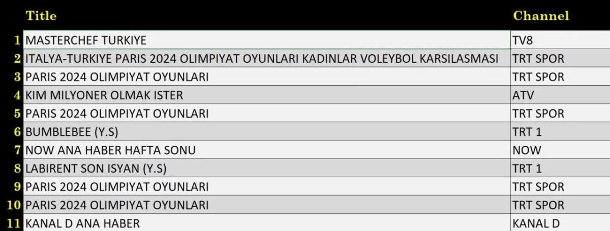 AB'de 1.sırada “Masterchef Türkiye”, 2.sırada TRT Spor’da ekrana gelen “İtalya-Türkiye Paris 2024 Olimpiyat Oyunları Kadınlar Voleybol Karşılaşması”, 3.sırada TRT Spor’da yayınlanan “Paris 2024 Olimpiyat Oyunları” yer aldı.