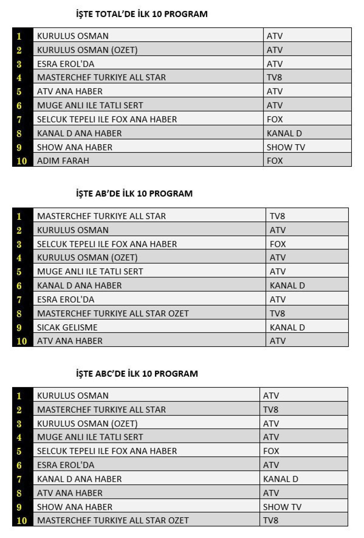 Total'de reyting listesinin ilk sırasında Kuruluş Osman, İkinci sırada Kuruluş Osman özet, üçüncü sırada ise Esra Erol'da yer aldı.