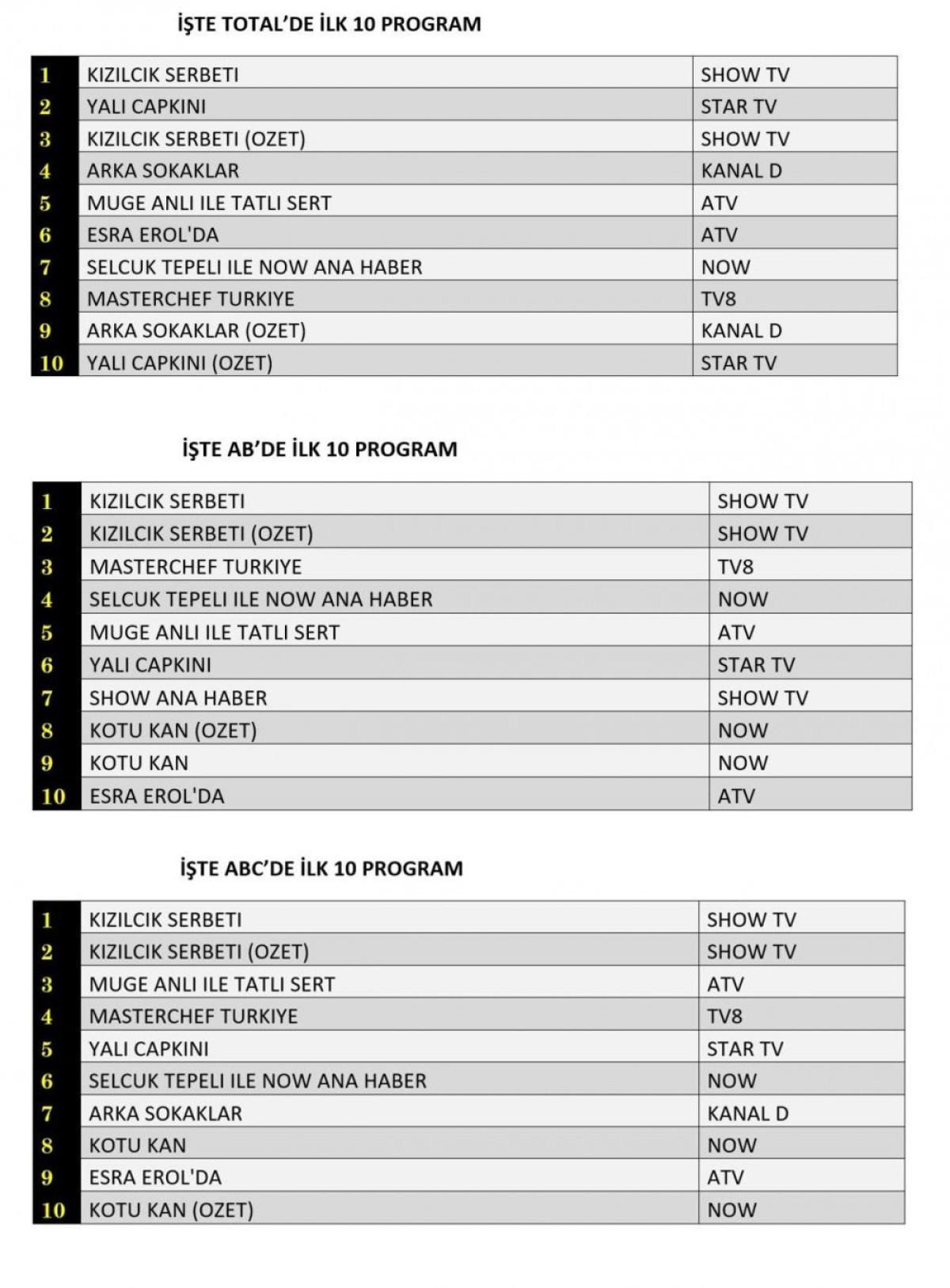Her gün bir önceki güne ait Total, AB ve ABC sıralaması belli olurken dünün reyting sonuçları merakla bekleniyor.