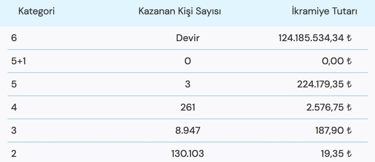Büyük ikramiyenin 126.435.847,40 TL olduğu çekilişte 6 bilen çıkmadığı için büyük ikramiye devretti.