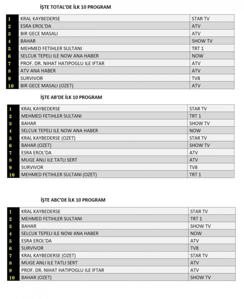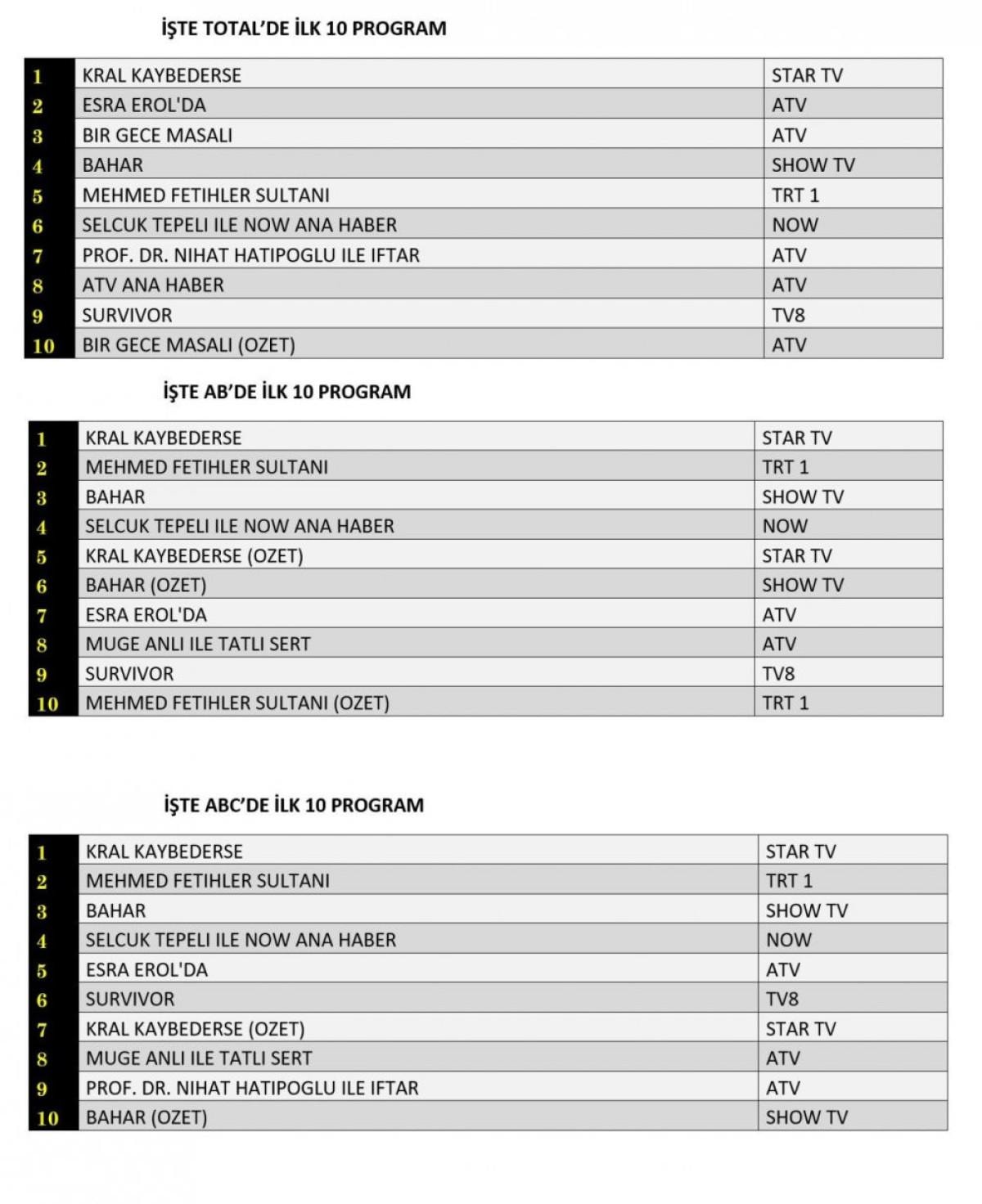 Her gün bir önceki güne ait Total, AB ve ABC sıralaması belli olurken dünün reyting sonuçları merakla bekleniyor.
