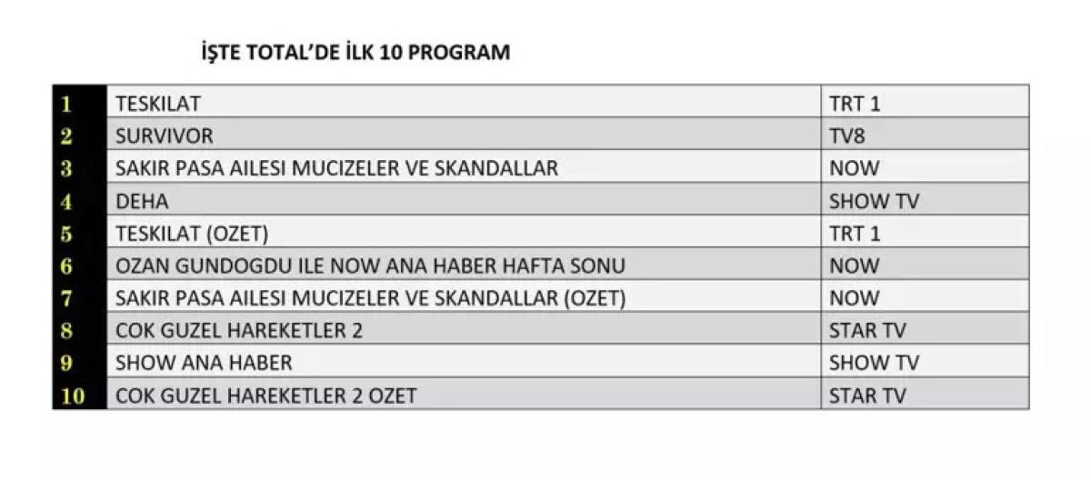 Total grubunda zirveye TRT1'de yayınlanan Teşkilat dizisi yerleşti. İkinci sırada Survivor, üçüncü sırada ise Şakir Paşa Ailesi Mucizeler ve Skandallar yer aldı.