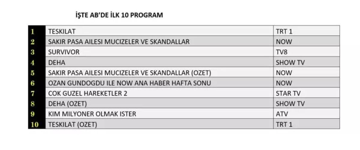 AB grubunda yine birinci Teşkilat dizisi oldu. İkinci sırada Şakir Paşa Ailesi Mucizeler ve Skandallar, üçüncü sırada ise Survivor yarışma programı yer aldı.