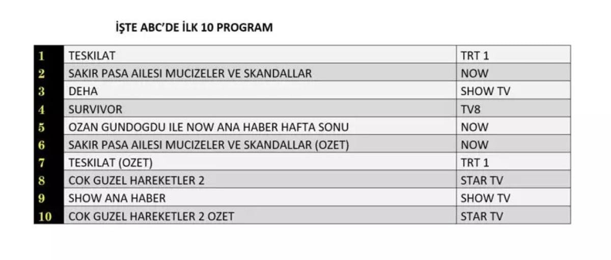 Her gün bir önceki güne ait Total, AB ve ABC sıralaması belli olurken dünün reyting sonuçları merakla bekleniyor.