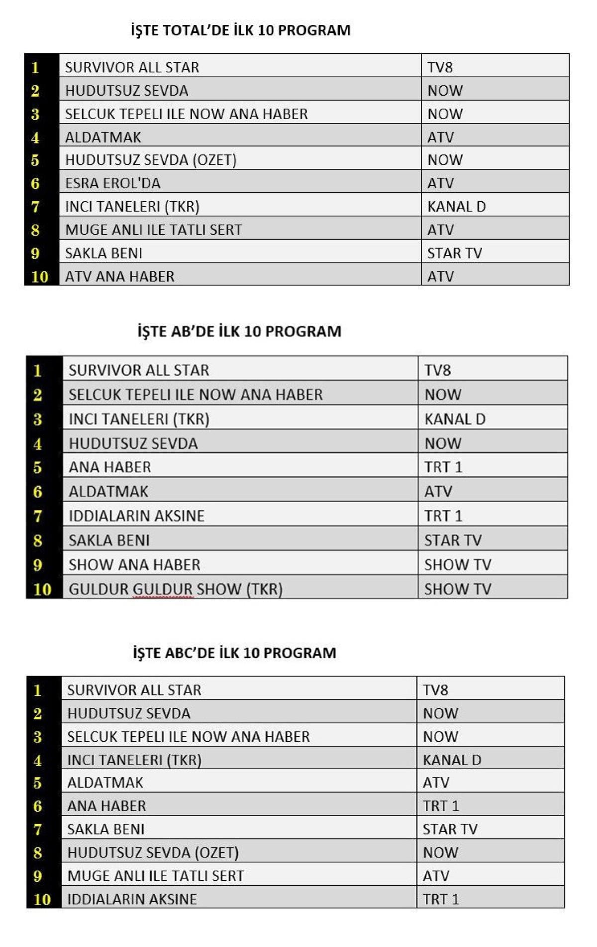 AB'de birinci sırada Survivor All Star, ikinci sırada Selçuk Tepeli ile NOW Ana Haber, üçüncü sırada İnci Taneleri tekrar yer aldı.