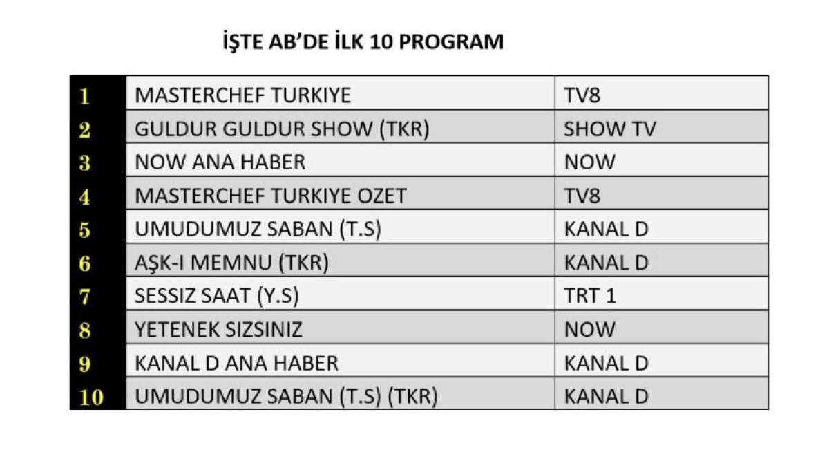 AB’de 1. sırada “Masterchef Türkiye”, 2. sırada “Güldür Güldür Show (Tekrar) ”, 3. sırada ise “Now Ana Haber” yer aldı.