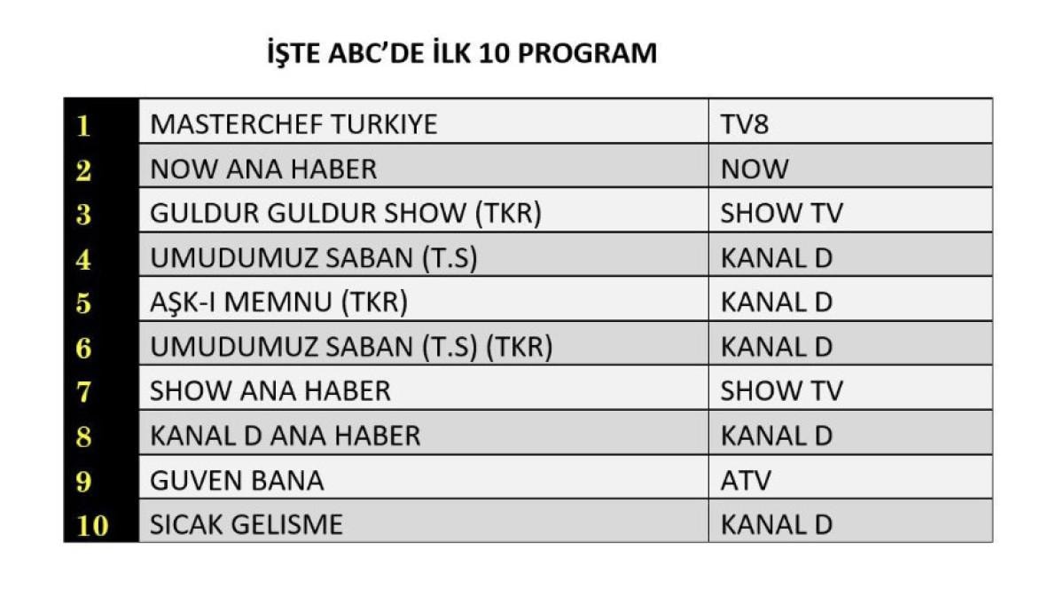 ABC’de 1. sırada “Masterchef Türkiye”, 2. sırada “Now Ana Haber”, 3. sırada ise “Güldür Güldür Show (Tekrar)” yer aldı.