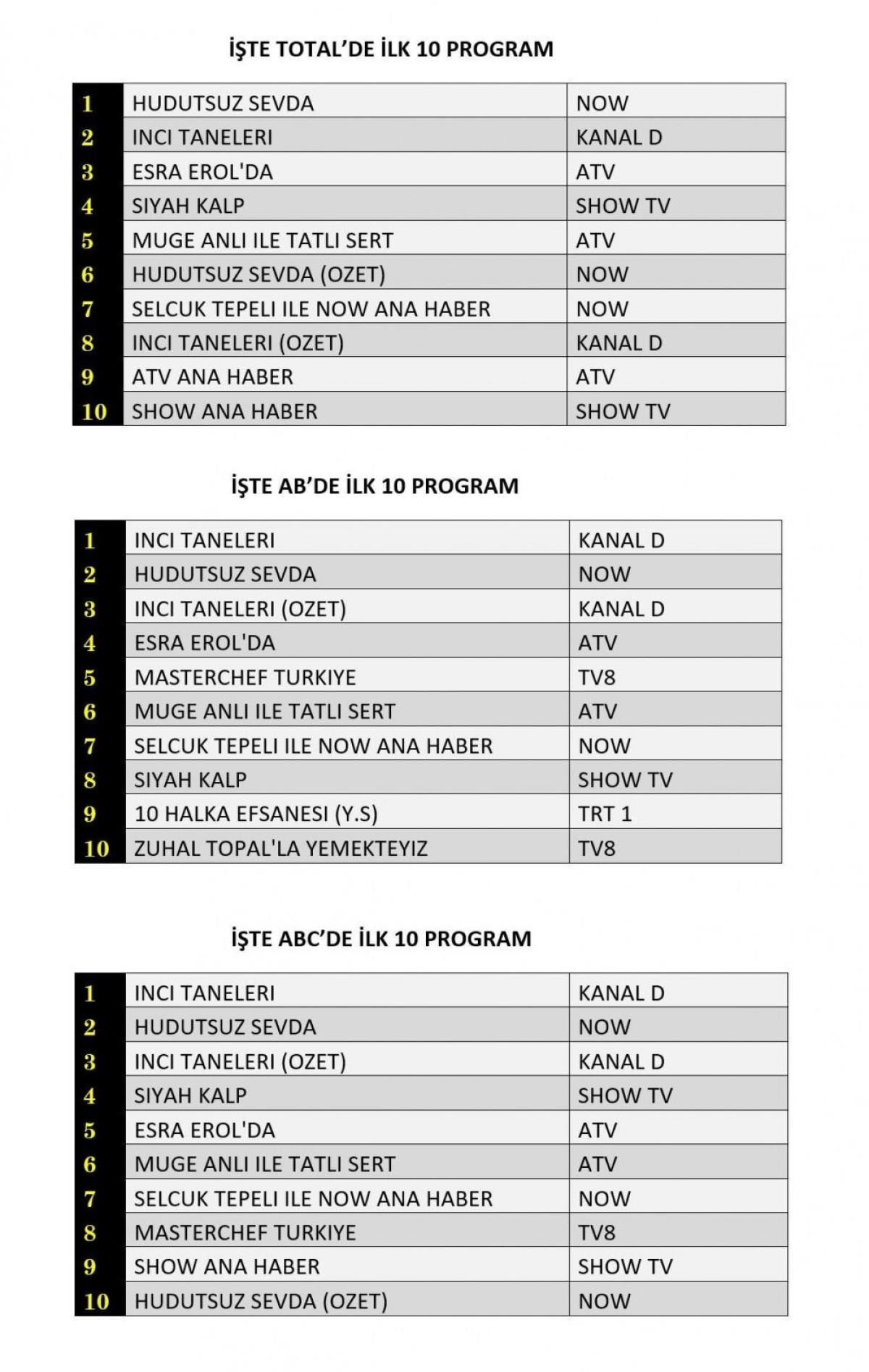 ABC'de ise 1.sırada “İnci Taneleri”, 2.sırada “Hudutsuz Sevda”, 3.sırada “İnci Taneleri” dizisinin özeti yer aldı.