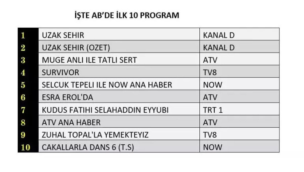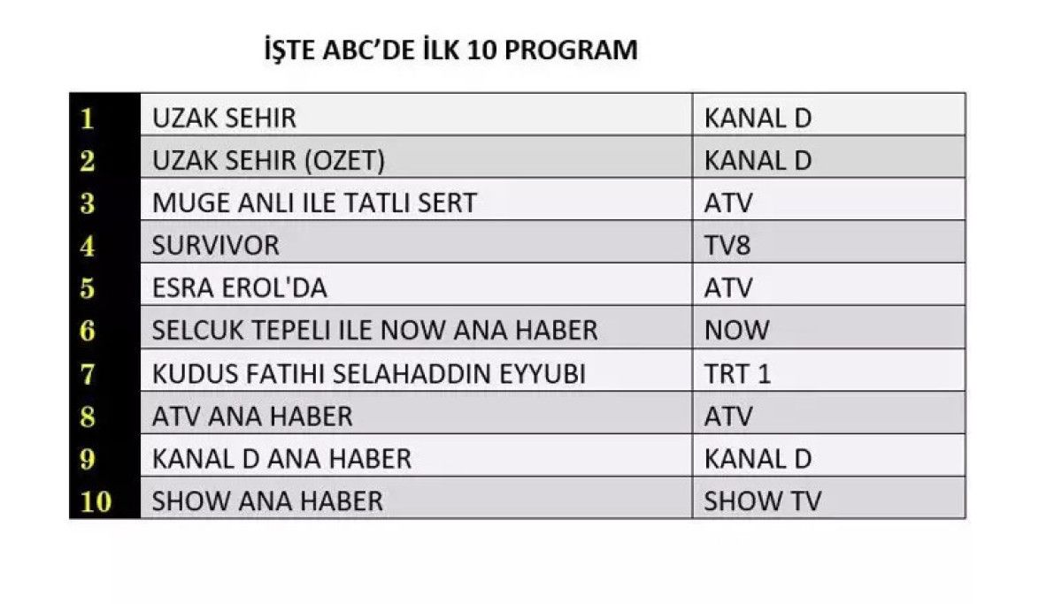 Her gün bir önceki güne ait Total, AB ve ABC sıralaması belli olurken dünün reyting sonuçları merakla bekleniyor.