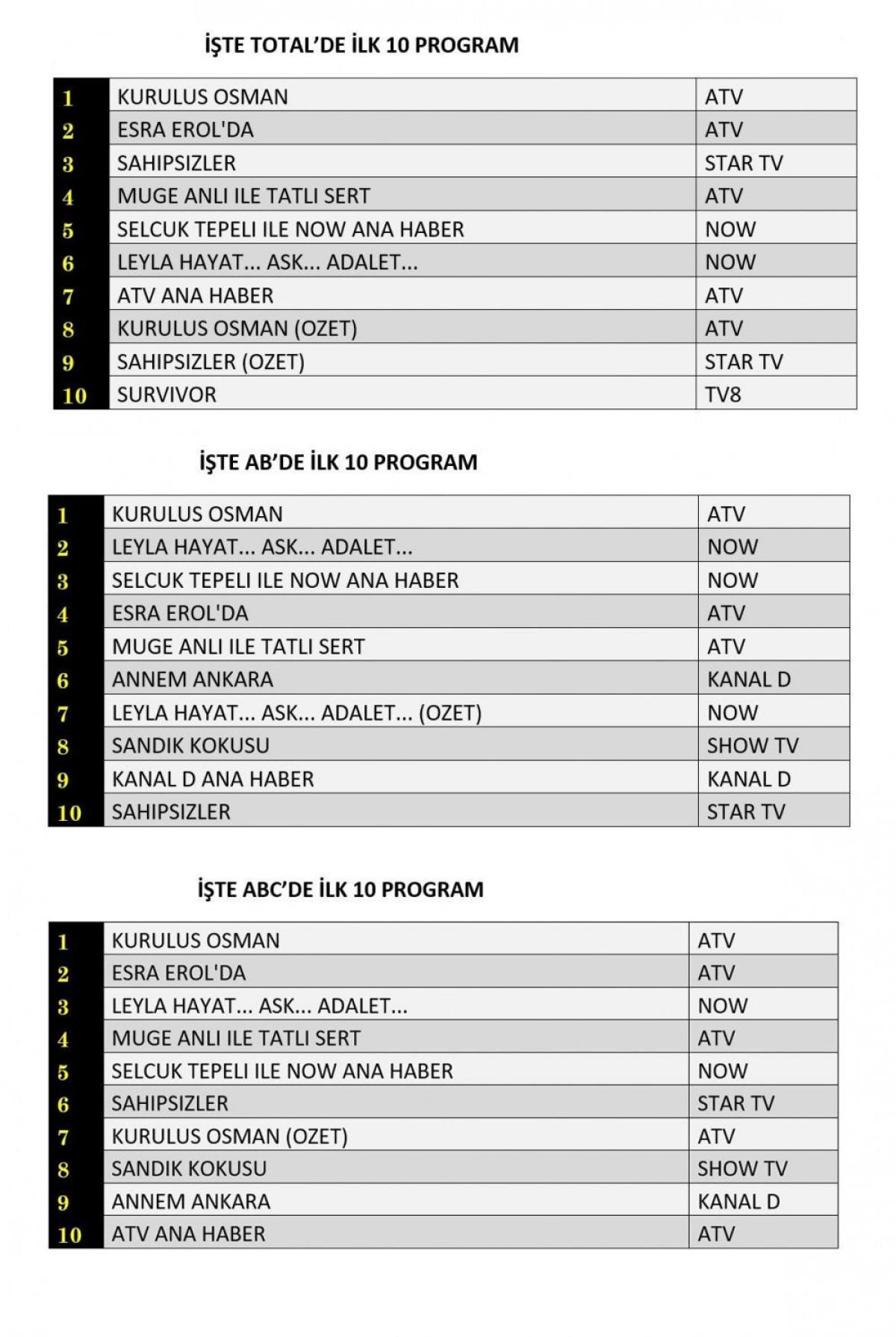 ATV'nin sevilen dizisi Kuruluş Osman, 3 kategoride de zirveye yerleşti. Esra Erol'da ise Total'de ve ABC grubunda 2. sırayı kaptı.