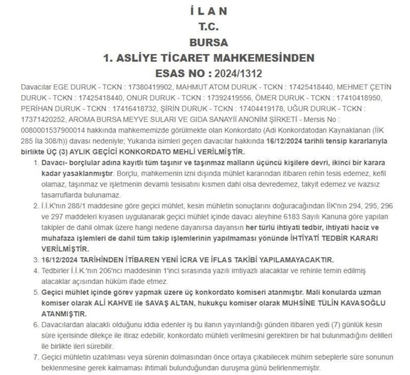 Bursa 1. Asliye Ticaret Mahkemesi, Aroma'nın başvurusu üzerine 16 Aralık 2024 tarihli kararla şirkete 16 Mart 2025 tarihine kadar geçici mühlet verdi.