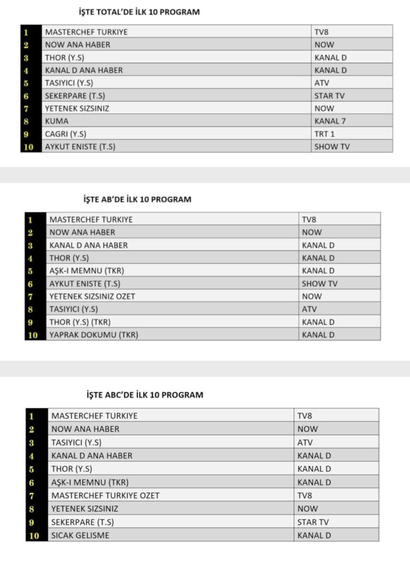 Her gün bir önceki güne ait Total, AB ve ABC sıralaması belli olurken dünün reyting sonuçları merakla bekleniyor.