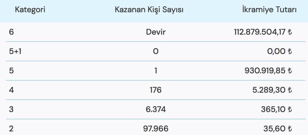 Büyük ikramiyenin 112.879.504,17 TL olduğu çekilişte 6 bilen çıkmadığı için büyük ikramiye devretti.