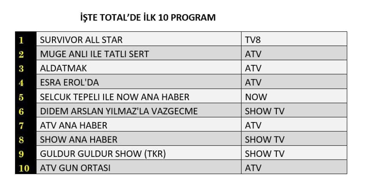 Total'de reyting listesinin ilk sırasında Survivor All Star, ikinci sırada Müge Anlı ile Tatlı Sert, üçüncü sırada Aldatmak yer aldı.