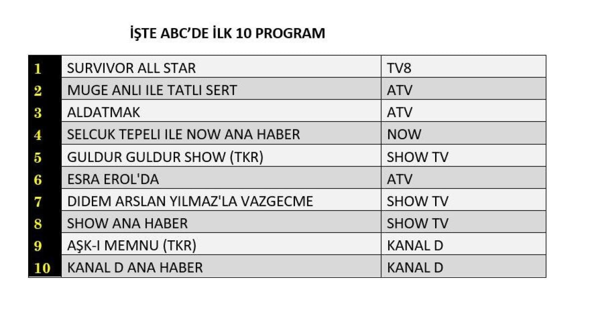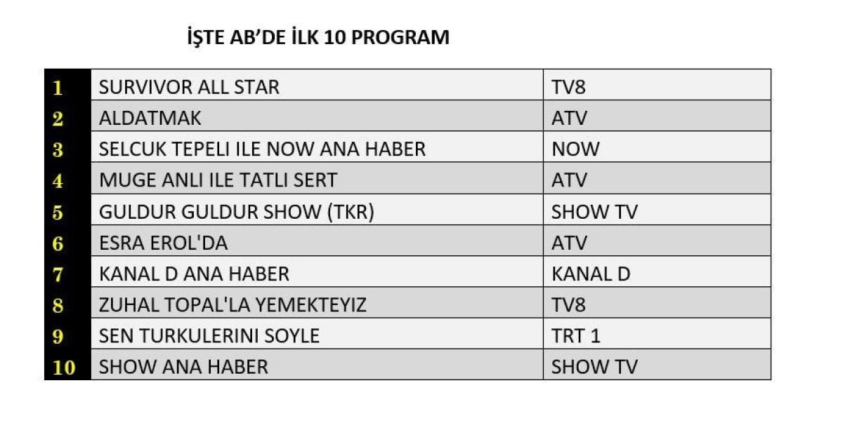 AB'de birinci sırada Survivor, ikinci sırada Aldatmak, üçüncü sırada Selçuk Tepeli ile NOW Ana Haber yer aldı.