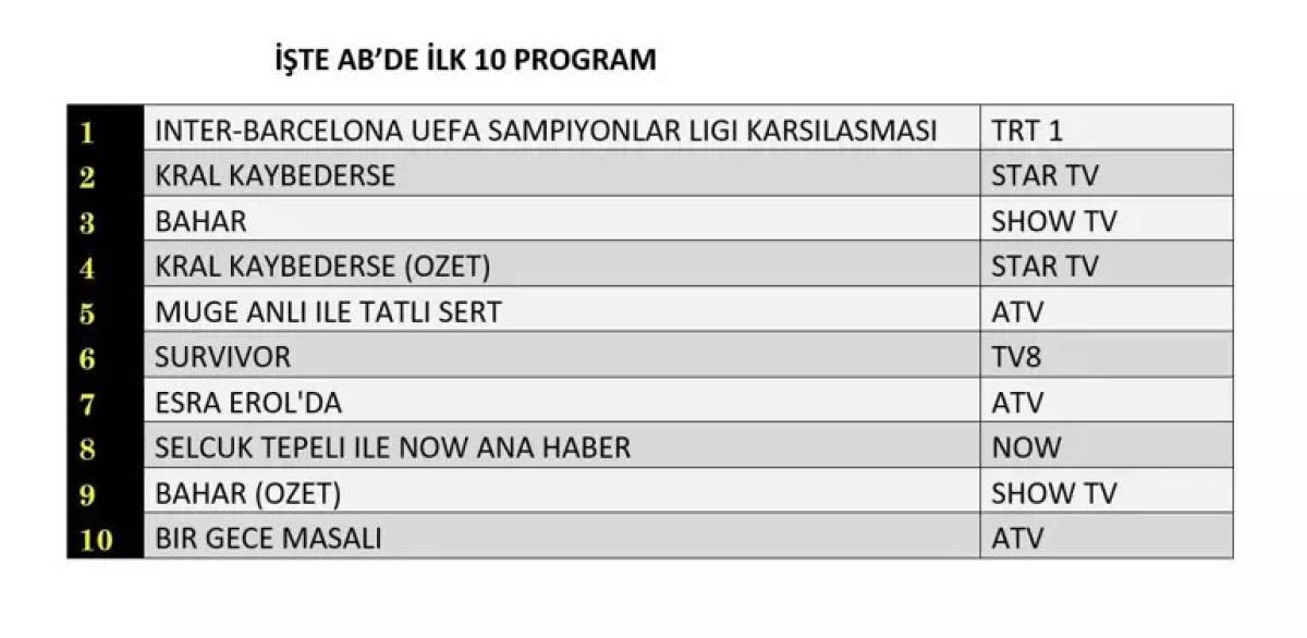 İkinci sırada ise Star TV'de yayınlanan Kral Kaybederse dizisi yer aldı. Üçüncü sıraya Bahar dizisi yerleşti.