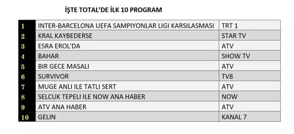 Her gün bir önceki güne ait Total, AB ve ABC sıralaması belli olurken dünün reyting sonuçları merakla bekleniyor.
