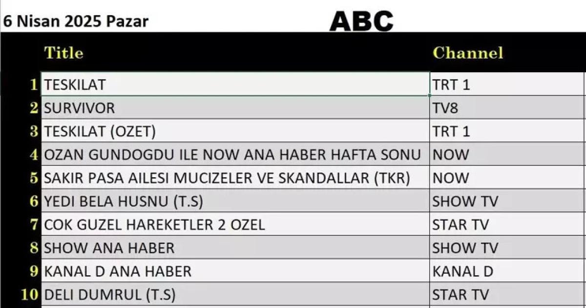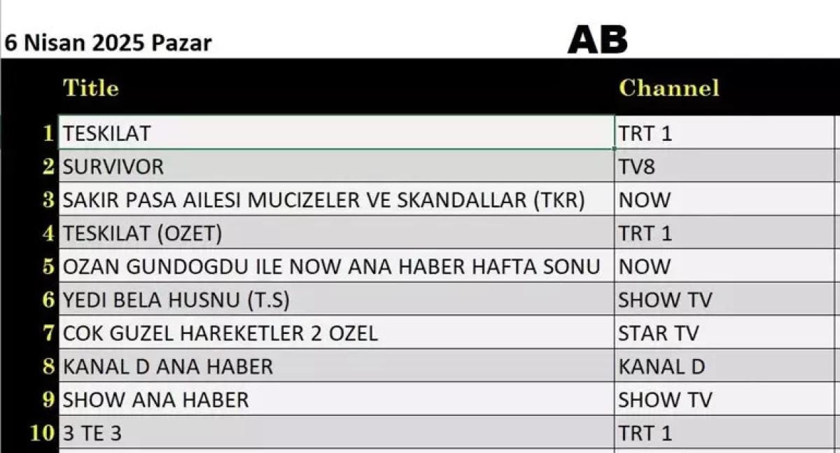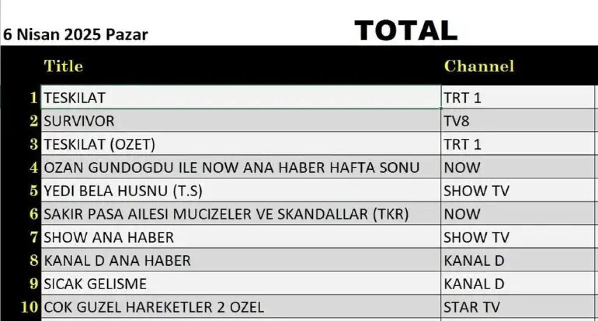 6 Nisan Pazar gününe ilişkin reyting sonuçları açıklandı. TRT 1’in sevilen dizisi Teşkilat zirveyi kaptı.