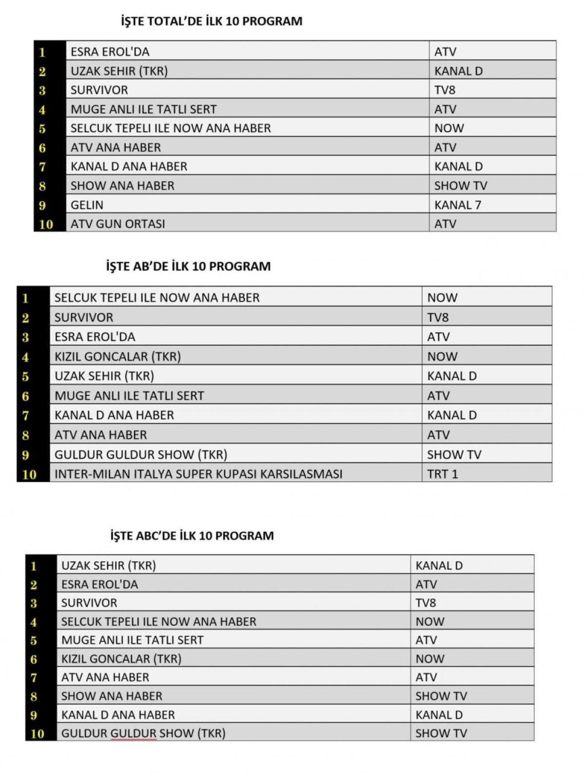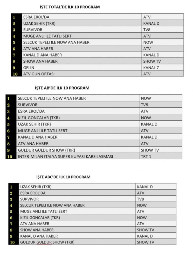 Her gün bir önceki güne ait Total, AB ve ABC sıralaması belli olurken dünün reyting sonuçları merakla bekleniyor.