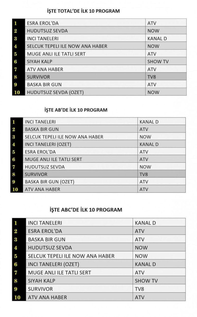 Her gün bir önceki güne ait Total, AB ve ABC sıralaması belli olurken dünün reyting sonuçları merakla bekleniyor.