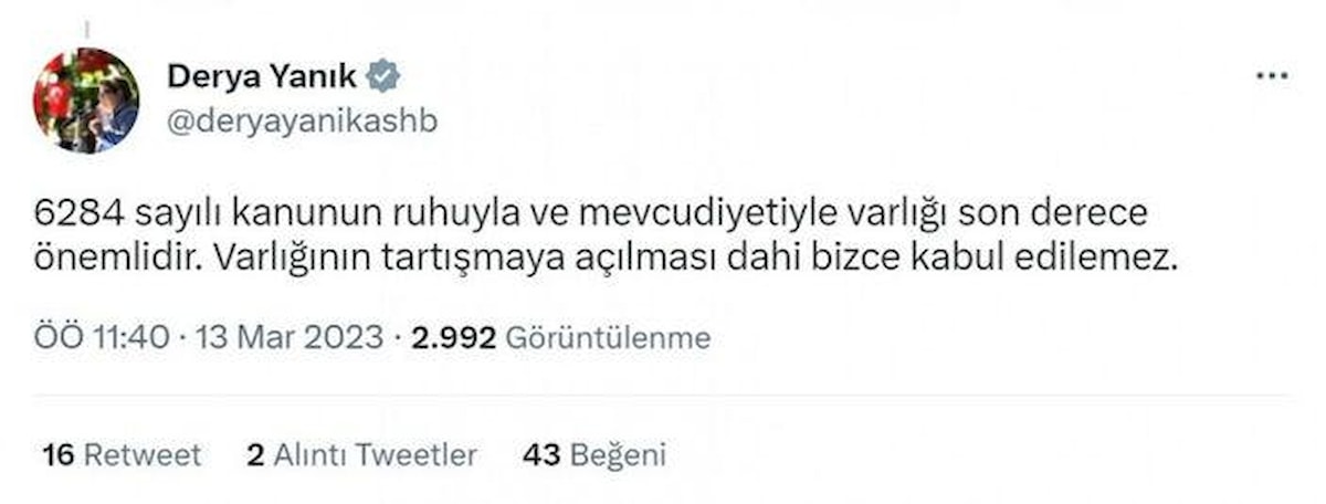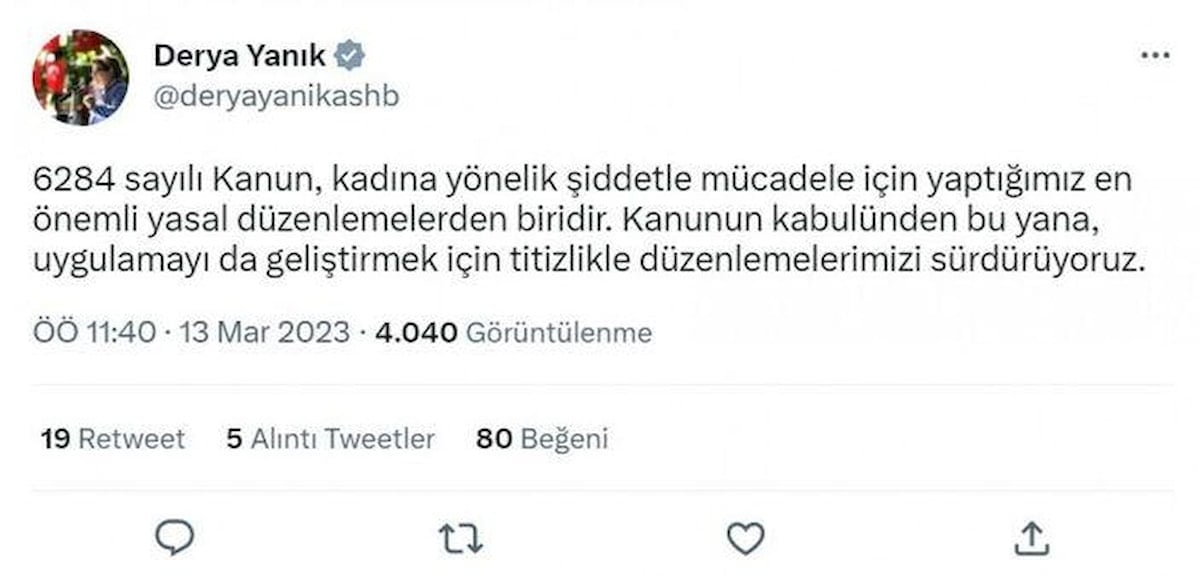 Aile ve Sosyal Hizmetler Bakanı Derya Yanık, Twitter'daki hesabından 6284 sayılı 'Ailenin Korunması ve Kadına Karşı Şiddetin Önlenmesine Dair Kanun' ile ilgili açıklama yaptı.