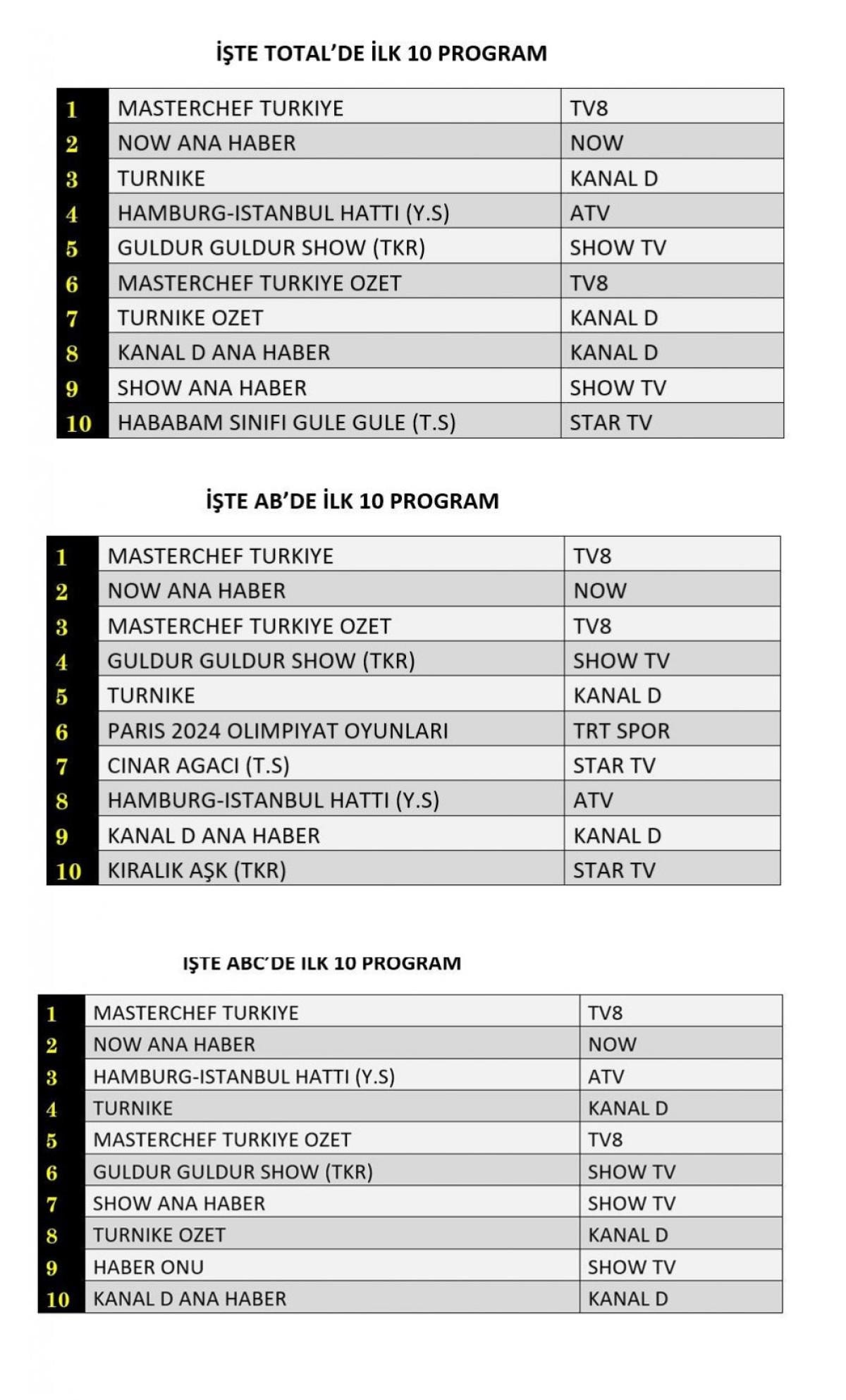 Her gün bir önceki güne ait Total, AB ve ABC sıralaması belli olurken dünün reyting sonuçları merakla bekleniyor.