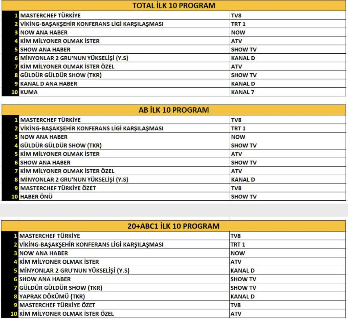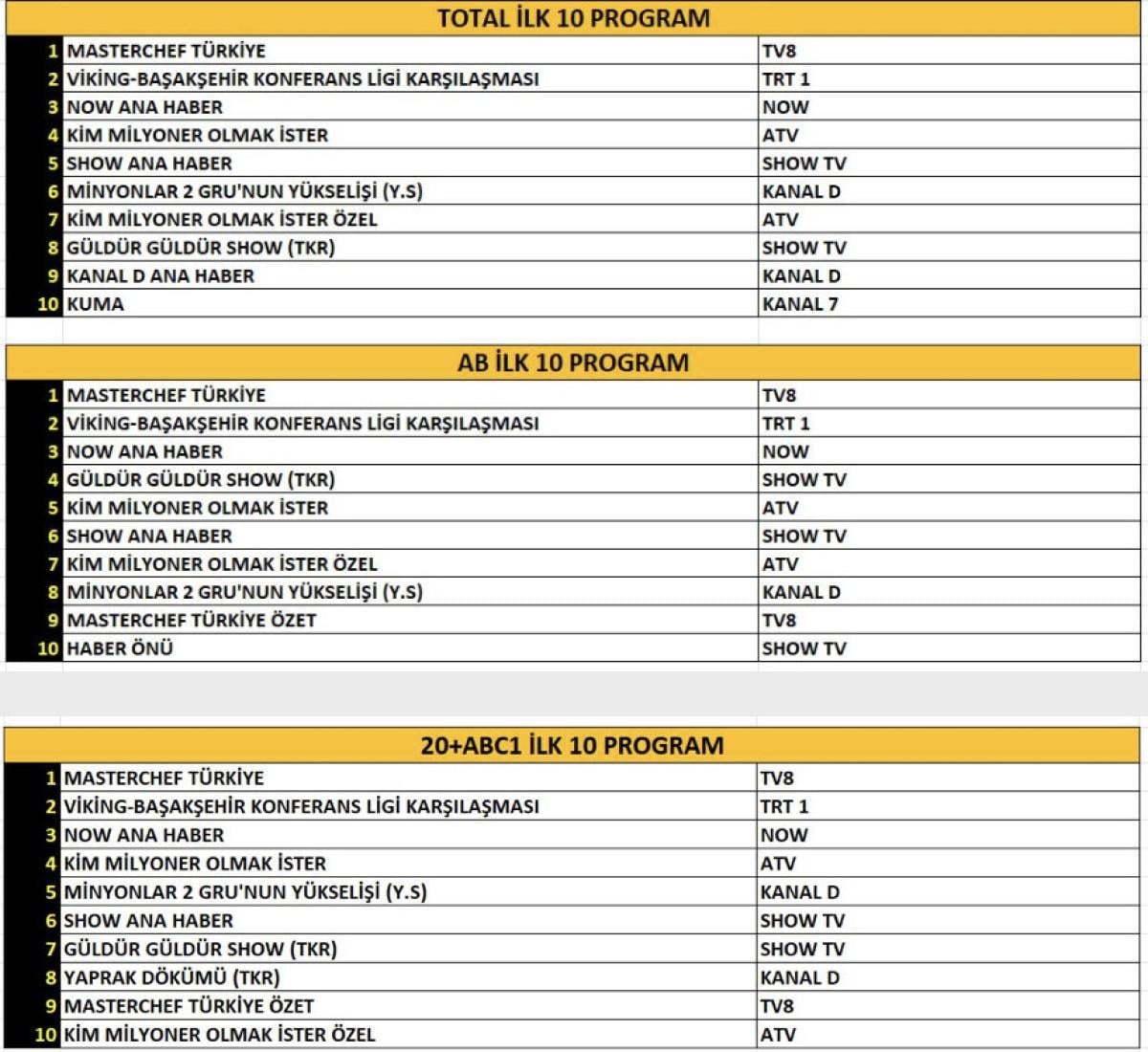 AB grubunda ise lider “Masterchef Türkiye” oldu. İkinci sırayı “Viking-İstanbul Başakşehir” karşılaşması, üçüncü sırayı ise “NOW Ana Haber” aldı.