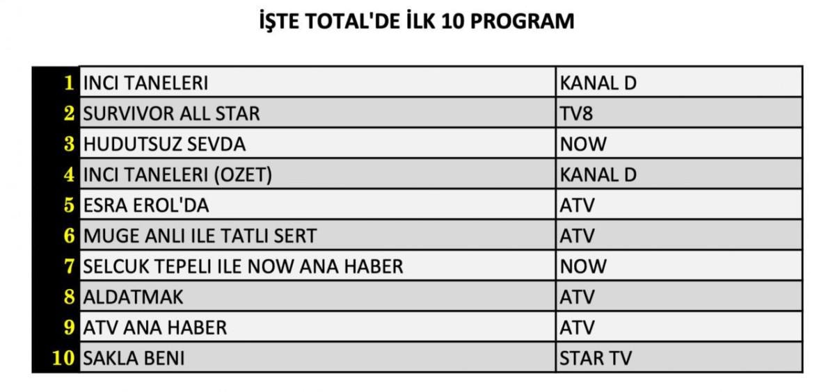 Total’de 1. sırada Kanal D’de izleyici ile buluşan “İnci Taneleri” yer aldı. 2. sırada tv8’de ekranlara gelen “Survivor All Star” yer aldı. 3. sırada ise Now’da yayınlanan “Hudutsuz Sevda” programı yer aldı.