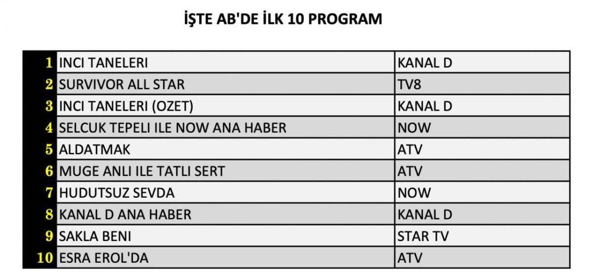 AB’de 1. sırada “İnci Taneleri” yer aldı. 2. sırada “Survivor All Star” yer aldı. 3. sırada ise “İnci Taneleri” özet bölümü yer aldı.