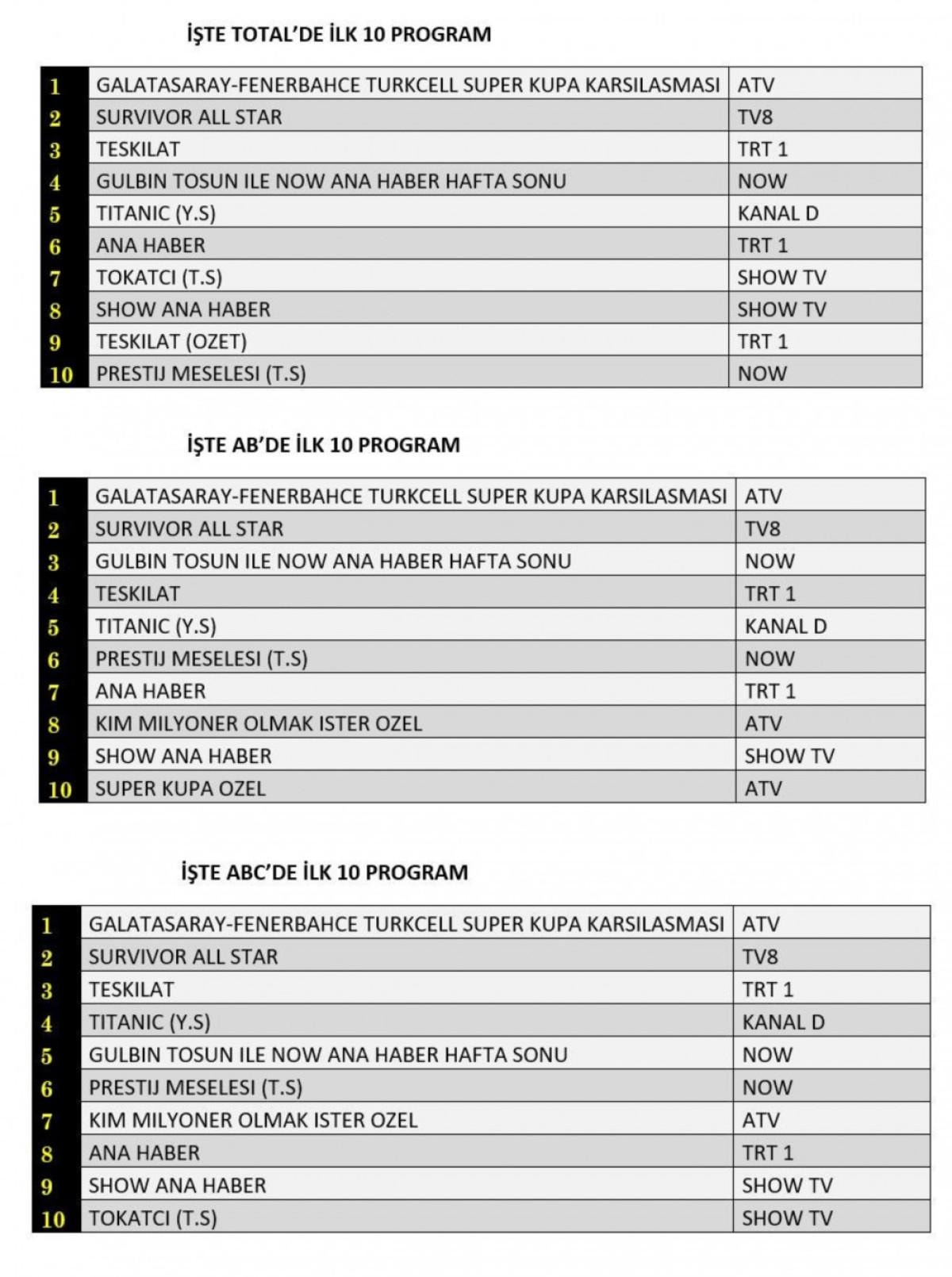 ABC'de ise 1.sırada “Galatasaray-Fenerbahçe Türkcell Süper Kupa Karşılaşması”, 2.sırada “Survivor All Star”, 3.sırada “Teşkilat” dizisinin özeti yer aldı.