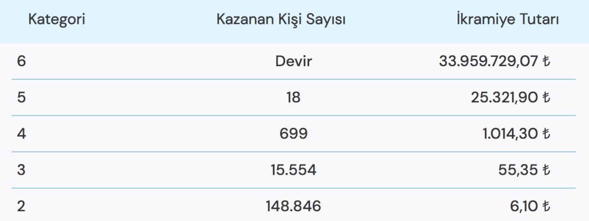 Büyük ikramiyenin 33.959.729,07 TL olduğu gecede 6 bilen çıkmadığı için büyük ikramiye bir sonraki çekilişe devretti.