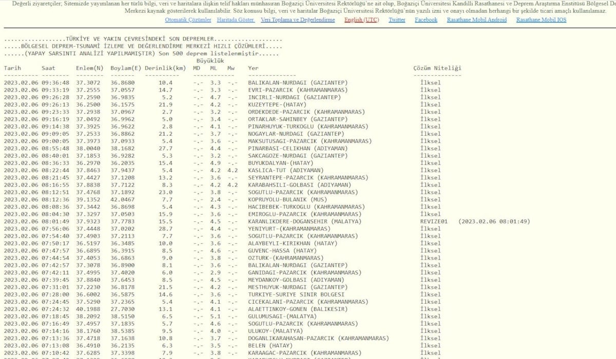 İşte Kandilli Rasathanesi'nin 7 Şubat 2023 deprem verileri:
