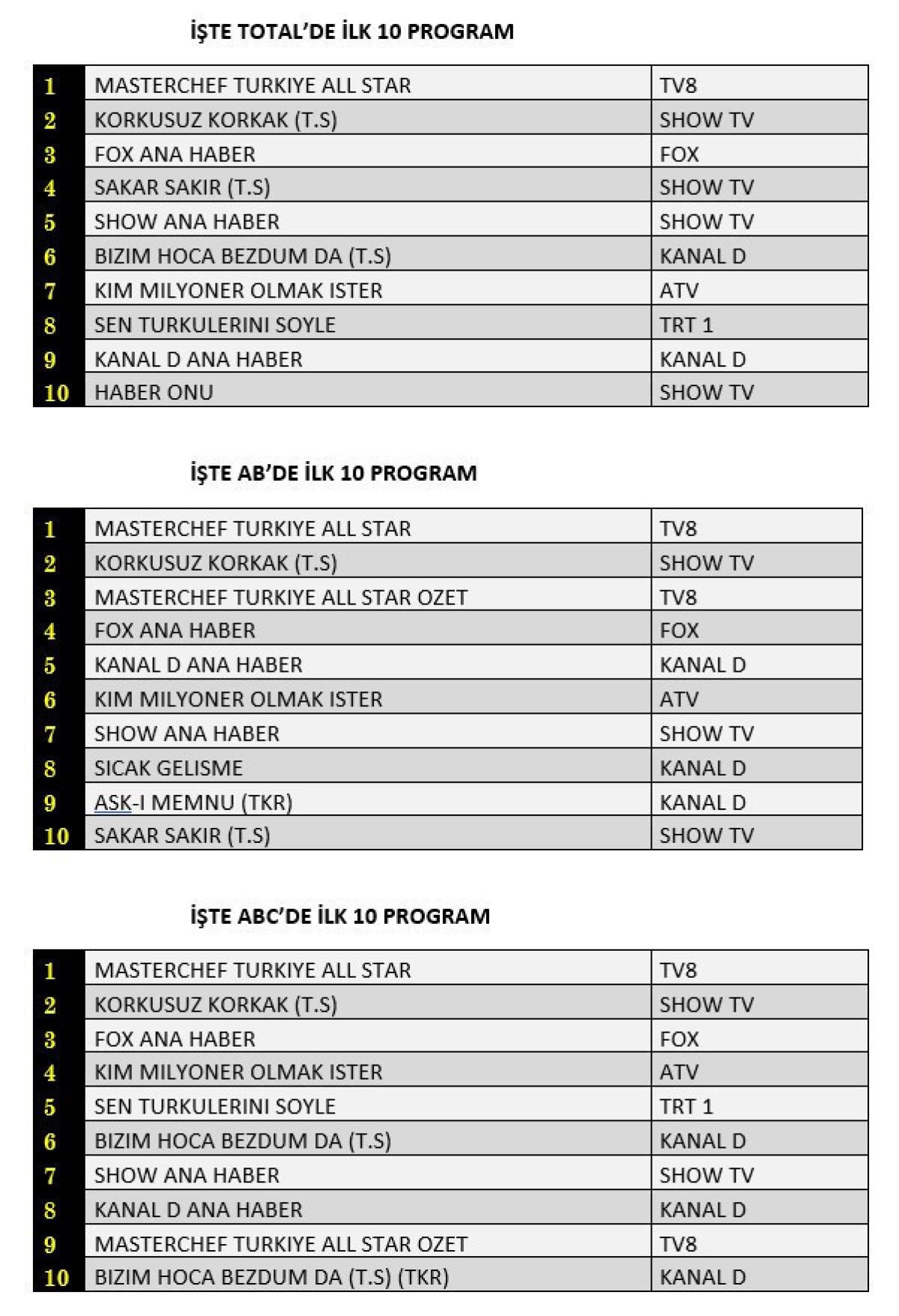 AB'de ise 1.sırada “Masterchef Türkiye All Star”, 2.sırada “Korkusuz Korkak”, 3.sırada “Masterchef Türkiye All Star Özet” yer aldı.