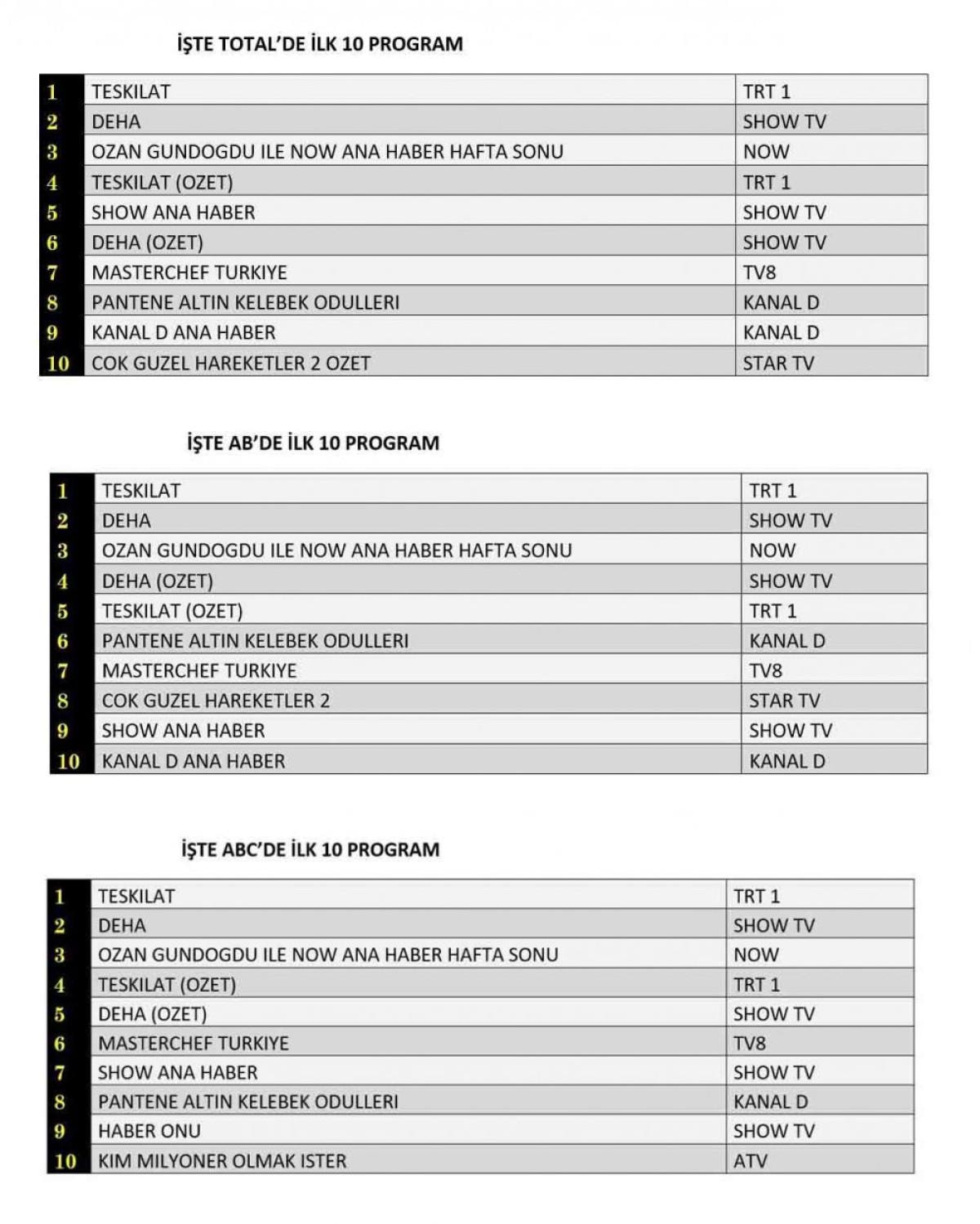 ABC kategorisinde 1. sırada Teşkilat yer aldı. 2. sırada Show TV’de izleyiciyle buluşan Deha dizisi, 3 sırada Ozan Gündoğdu İle Now Ana Haber Hafta Sonu yer aldı.