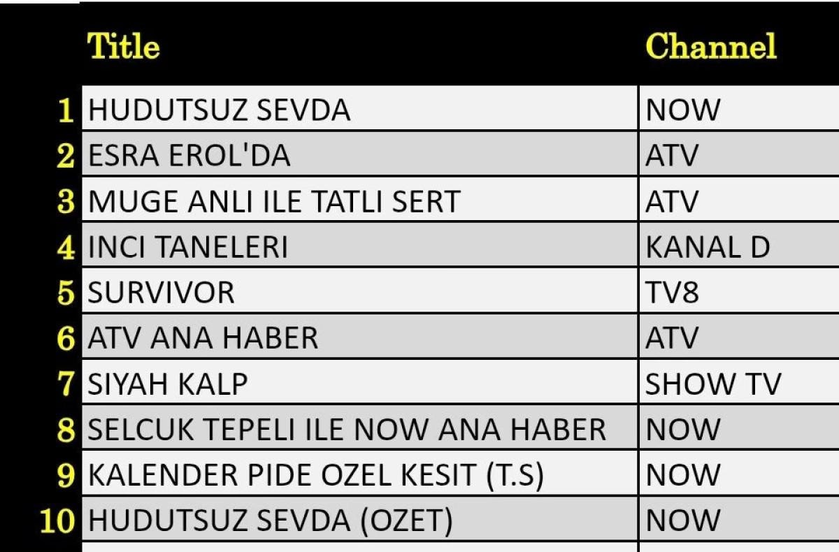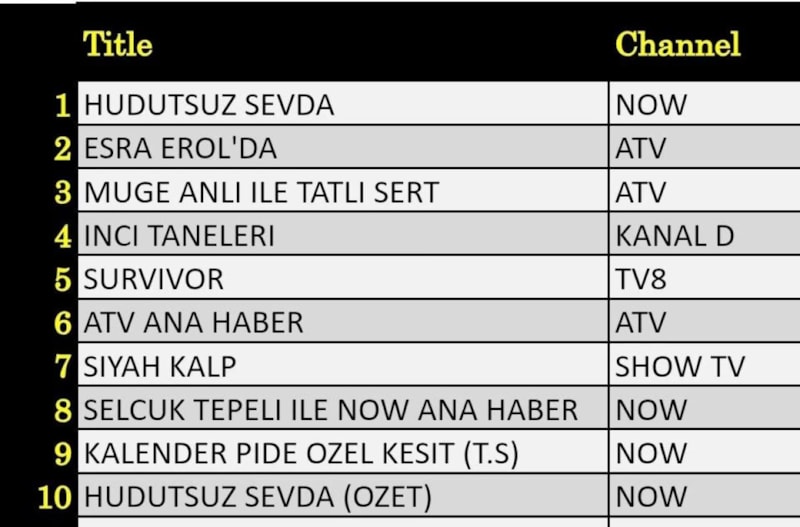 Total grubunda ilk sırada Hudutsuz Sevda dizisi yer aldı. İkinci sırada Esra Erol'da, üçüncü sırada ise Müge Anlı ile Tatlı Sert yer aldı.