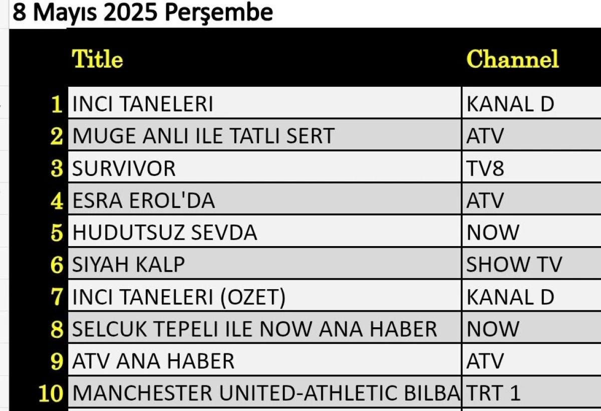 8 MAYIS PERŞEMBE REYTİNG SONUÇLARI