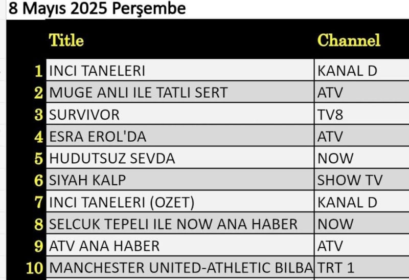8 Mayıs 2025 Perşembe günü birbirinden güzel programlar ekranlarda yerini aldı. İddialı yapımların reyting savaşı sona erdi. İşte zirvenin sahibi...